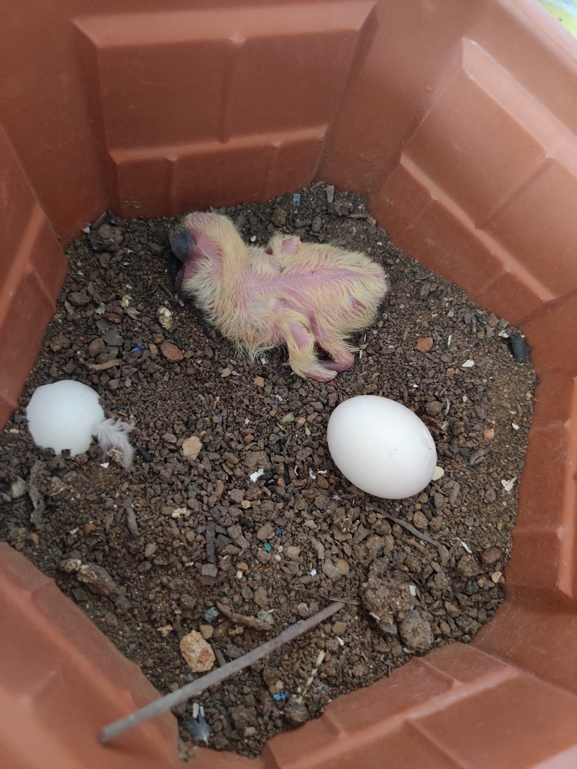 My apartment is very small but cosy. I tried growing plants in plant pots but the heat and my busy schedule made it impossible for anything to grow. A pigeon found a nice use for one of the pots, however, when it thought it would make a lovely next. Pigeons are quite well-known for being very lazy nest-builders, so it was nice to look inside one of the pots one day and see two little eggs. My dad always used to say, “you never see baby pigeons”, and he was right, until 4th July. The eggs hatched and brought two baby pigeons into the world and I’ve been keeping an eye on them ever since.