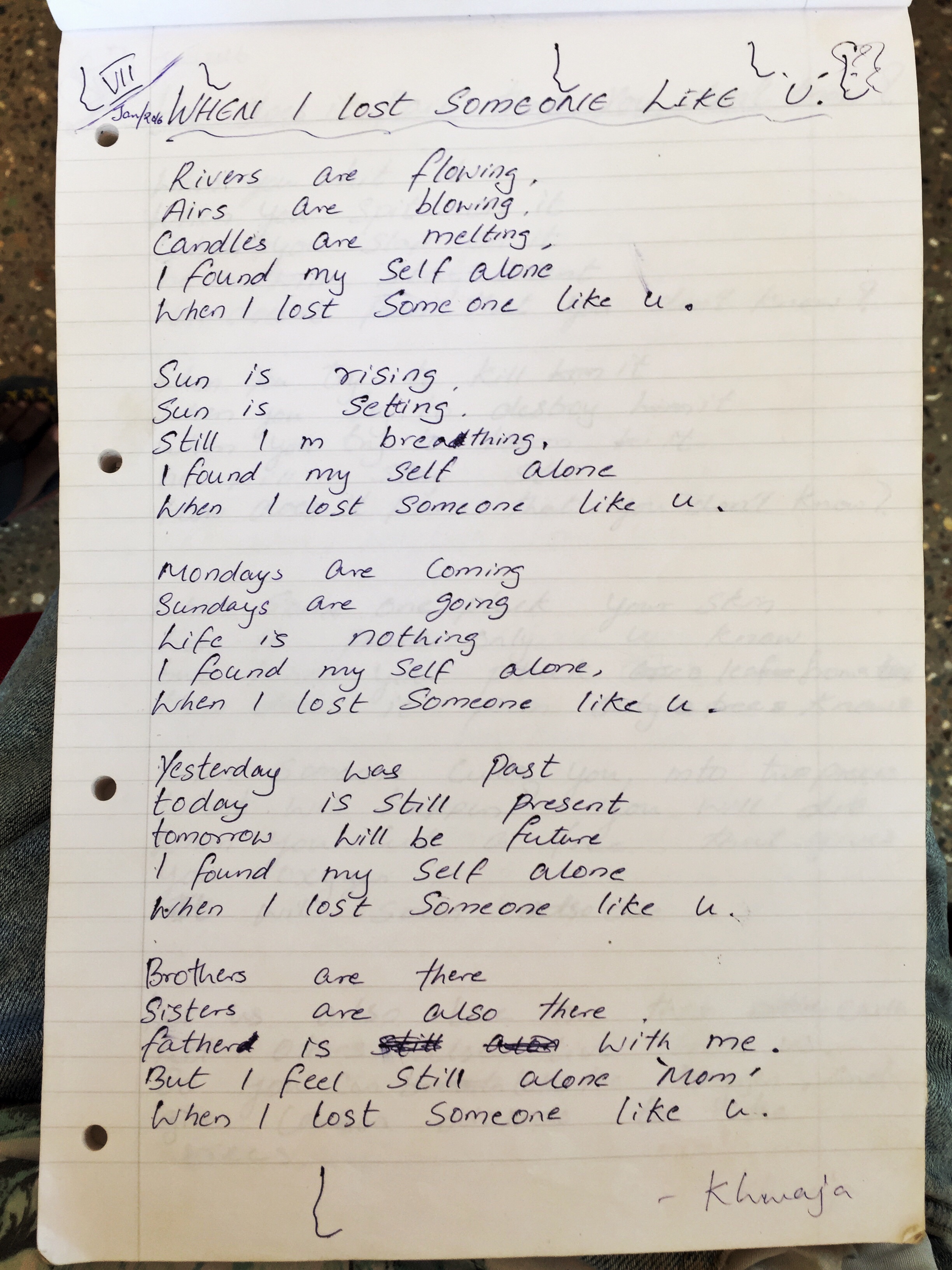Today, though, I want to tell you about Khwaja. Khwaja is 16 and highly academic. He gets on very well with adults, but doesn’t quite click with children of his own age, and because of this, he’s more comfortable living in the junior boys home. It’s something I can relate to – when I was a teenager, I didn’t like teenagers, mostly because they bullied me in P.E., but also because I was a sensitive, creative kid who either wanted to play piano or talk about Doctor Who during break-time. Khwaja has that same creative spark. On Saturday he wanted to show me his book of poems. It was a regular A4 loose-leaf paper pad with “Khwaja’s Poetry Book” written in blue ink on the blue cover. Inside were 37 poems written by this boy. I didn’t know what to expect, so I asked him to show me the one he’s most proud of. He turned to a poem called “When I Lost Someone Like You” written in blue biro on a page marked VII, written in January 2016 when he was 14 years old.